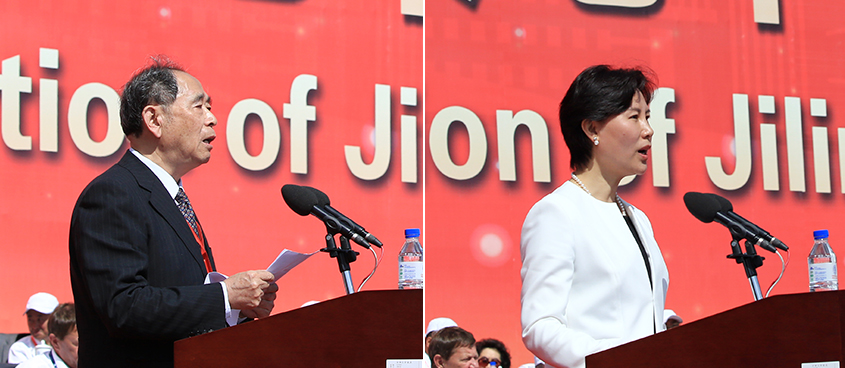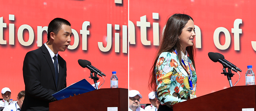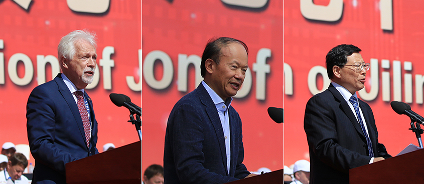 荷兰格罗宁根大学校长彭浦曼教授作为国外合作大学代表,美国工程院院士、普林斯顿大学李凯教授和中国科学院院士何满潮教授作为校友代表,吉林大学哲学社会科学资深教授刘中树、中国科学院院士于吉红教授作为教师代表,汽车工程学院2016级本科生林聪同学、公共外交学院2016级学生玛莎同学作为新生代表和留学生代表也分别在庆祝大会上致辞。