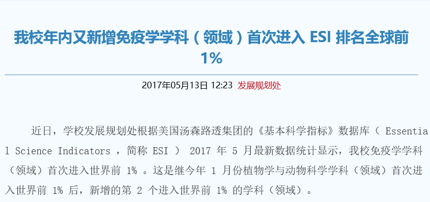 近日,学校发展规划处根据美国汤森路透集团的《基本科学指标》数据库( Essential Science Indicators ,简称 ESI ) 2017 年 5 月最新数据统计显示,我校免疫学学科(领域)首次进入世界前 1% 。这是继今年 1 月份植物学与动物科学学科(领域)首次进入世界前 1% 后,新增的第 2 个进入世界前 1% 的学科(领域)。