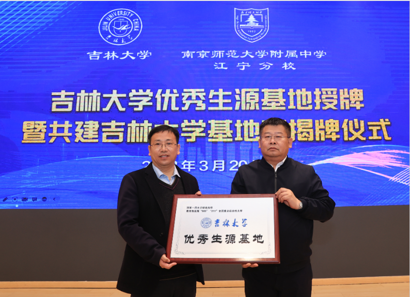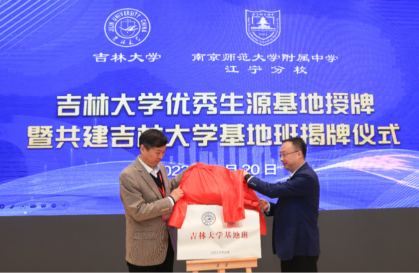 【文/摄 记者徐立华】3月19日,南京师范大学附属中学江宁分校“吉林大学基地班”在南京正式揭牌。吉林大学党委常委、副校长赵宏伟,江宁分校党委书记、校长张士民出席仪式并致辞。吉林大学南京校友会顾问杜晓明、常务副会长秦臻、秘书长王小明等南京校友会、山东校友会的校友代表出席活动。
