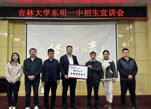 地球科学学院党委副书记李阳向东明县第一中学授予“吉林大学优秀生源基地”牌匾,并与到会县教育局领导、学校领导合影留念。