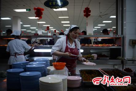 吉林大学共有23个食堂,吉林大学中心校区的新食堂是最大的一个,可以同时容纳6000人就餐。每天3时,采购部的李师傅就要起床,拿着当日菜 谱和同事到蔬菜批发市场,准备一天的食材。而新食堂的员工在5时30分也开始了一天的劳作。新食堂,面食部的师傅们每天要和7袋面粉,共350斤,要制作三四十种不同的面食。在新食堂开胃小菜区,有一位胖胖的女师傅,她叫侯秀荣,是冷荤部的师傅。每天5时30分她就要开始准备菜品。“每顿饭要准备四五十种 小菜,我们3个师傅一起做,要做3个半小时左右。”侯秀荣说。