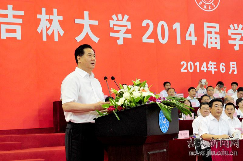 又是一年繁花似锦,栀子飘香;又是一季青春荡漾,毕业时光。今天,我们在这里隆重举行吉林大学2014届毕业生毕业典礼,为顺利完成学业的9577名本科生、6572名硕士生、1026名博士生、586名专科生以及来自36个不同国家和地区的203名留学生们出征壮行!同学们,今天,你们光荣毕业啦!在这个庄严而又神圣的时刻,我谨代表陈德文书记、代表学校党政领导班子、代表全校教职员工,向你们表示最衷心的祝贺!同时,也向辛勤抚育你们的父母家人和悉心培养你们的广大教职工致以最诚挚的感谢!