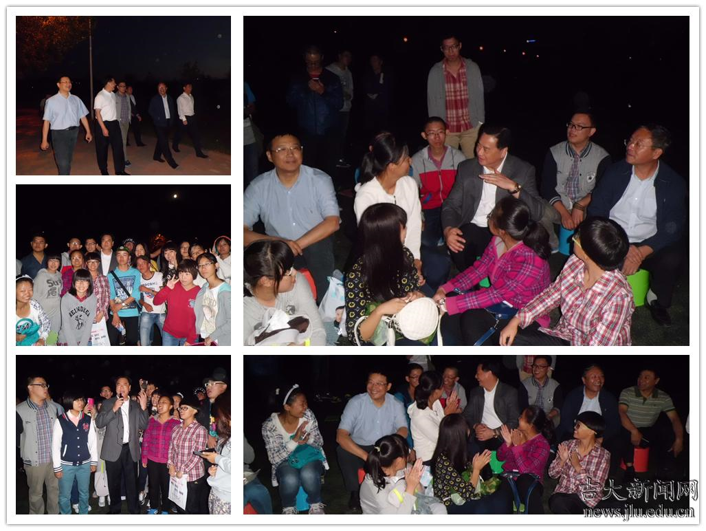 在位于校园西部的体育运动场,法学院200多名新生正在辅导员的带领下开展庆中秋素质拓展活动。看到校长到来,学生们一点没有陌生感,就像见到自己的家人,团团围坐在校长身旁。校长也和他们聊起了家常。“你的家乡在哪里呀”“你们的考分是很高的呦”,校长的肯定让学子脸上充满的自豪。李元元动情地说:“中秋是我们中华民族传统佳节,今晚,我们代表学校以及全校教职员工看望你们,祝你们中秋节快乐!每逢佳节倍思亲。今年的中秋节是2014级新生第一次远离家乡、远离父母的第一个节日。你们就把吉大当成自己的家,把学校的老师当成自己的亲人。我的家在遥远的广东,我也想念我的家人,看到你们,我感到特别的亲切,我把你们当成自己的孩子。”月光如水,清辉轻轻地洒在学生的脸上;校长的话语正如亲人的轻声呼唤。“让校长和我们一起唱首歌吧!” 在学生们簇拥下,李元元深情地朗诵《吉林大学校歌》,和学子重温吉大人的梦想与追求。音乐响起,在场的学生和校领导高声齐唱校歌。“人比山高、脚比路长,跨越新世纪,去迎接轰响的红太阳!”皓月当空,嘹亮的吉大校歌伴随着秋风传遍校园。