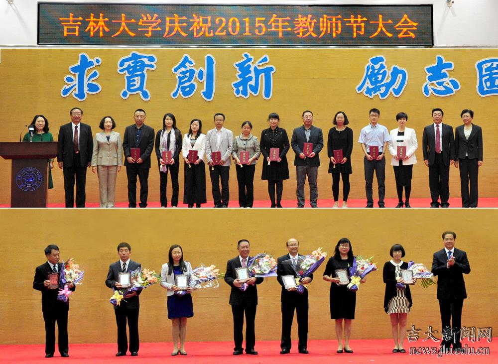 在庄严肃穆的国歌声中,吉林大学2015年庆祝教师节大会拉开帷幕。党委副书记兼副校长韩晓峰首先宣读了吉林大学第四届师德标兵和师德先进个人评选表彰决定。今年,全校有10人获评吉林大学师德标兵称号,22人获评吉林大学师德标兵提名奖,94人获评吉林大学师德先进个人称号。出席大会的校领导为吉林大学第四届师德标兵荣誉称号获得者、师德标兵提名奖获得者代表和先进个人代表颁奖。